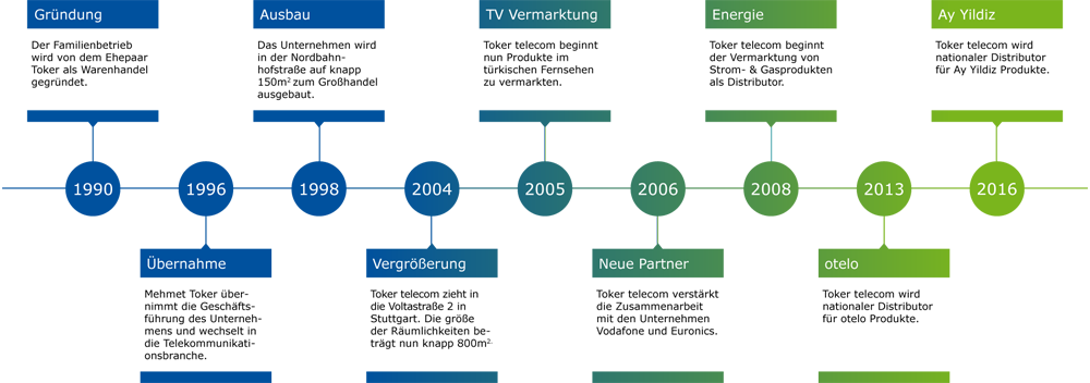 1990 wurde die Firma Toker telecom von dem Ehepaar Toker und ihrem Sohn Mehmet Toker gegründet. Nachdem der Dipl. Betriebswirt (FH) Mehmet Toker im Jahre 1996 in die Mobilfunkbranche einstieg, ließ sich ein rasantes Wachstum der Toker telecom GmbH registrieren. Erstmals als regionaler Großhandel gegründet, betreut das weiter aufstrebende Unternehmen mit seinen 25 Mitarbeitern heute weit über 500 Fachhändler in ganz Deutschland.